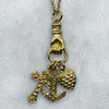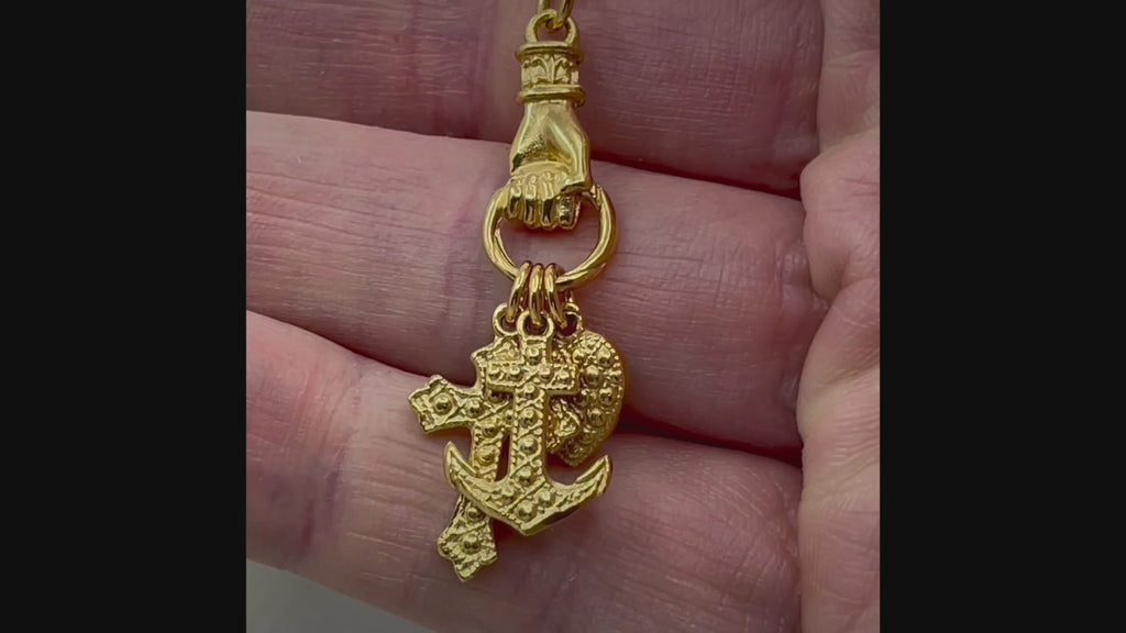A solid 24k gold plated 925 sterling silver grasping hand holding a cross, anchor and heart. These symbols represent faith, hope and charity.